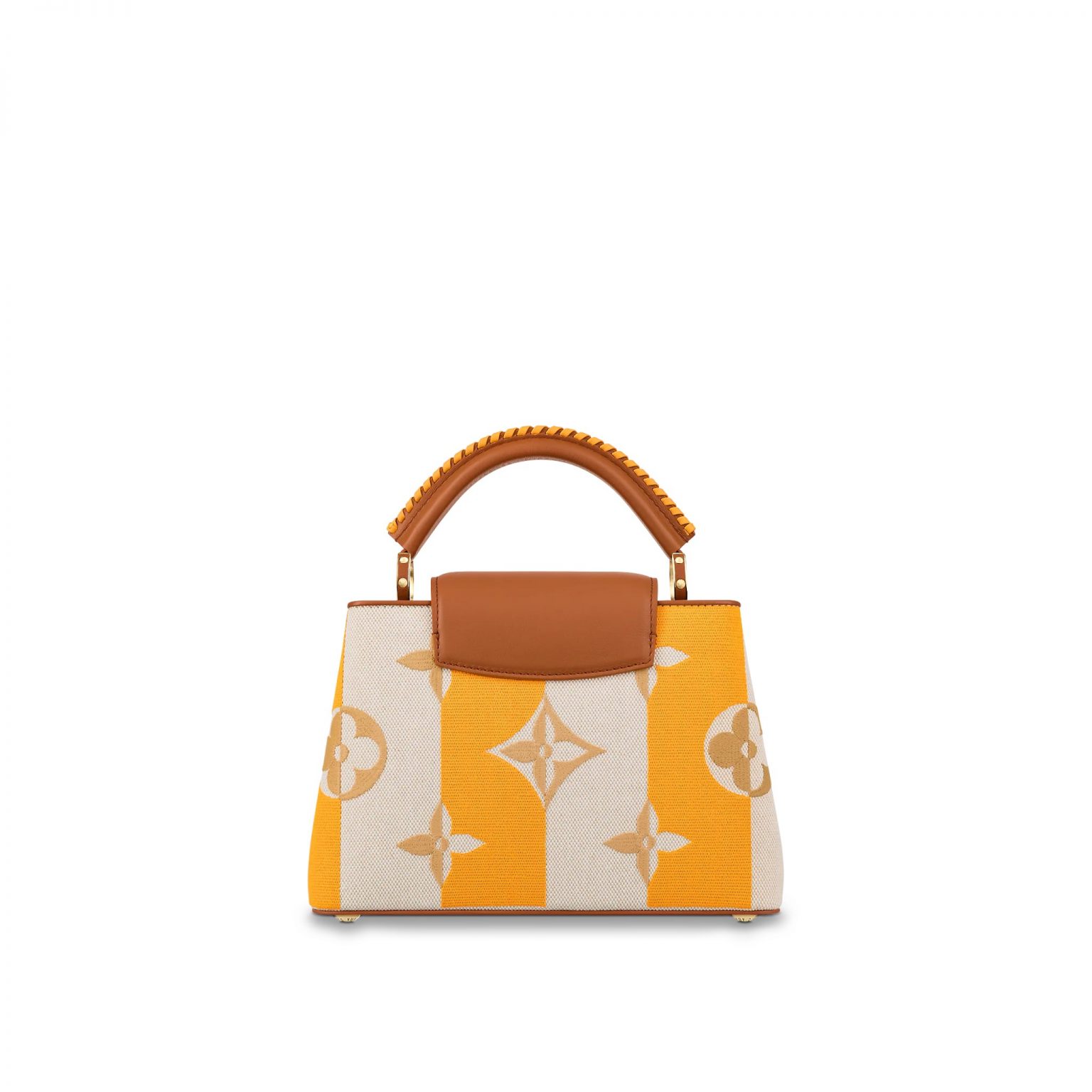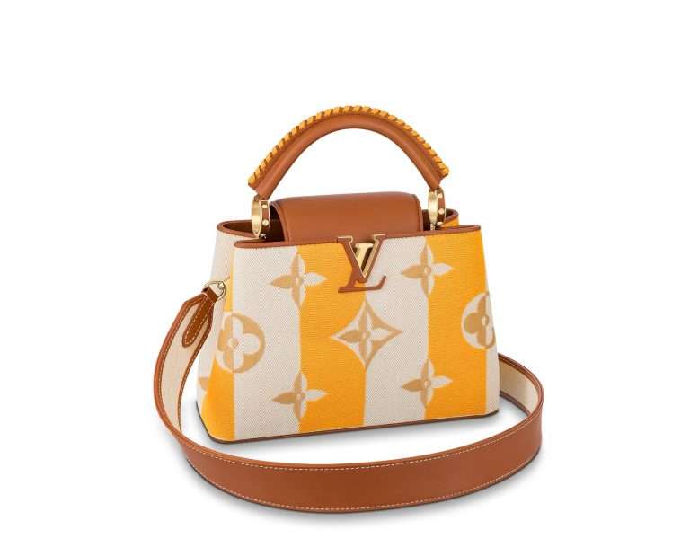 • Made from colorful striped canvas with natural leather trim, this adorable Capucines BB handbag has a two-color braided leather top handle as well as a wide removable strap.