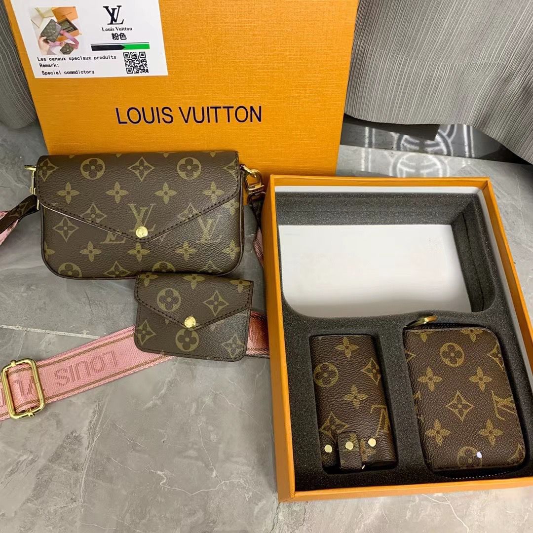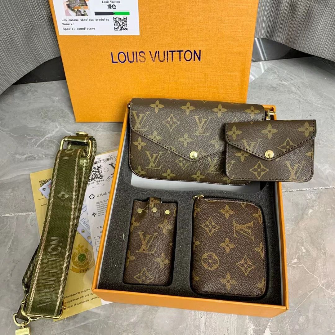 Lv Felicie Set With Box 4 Pcs Set With Brand Box Coin Holder Key Holder Card Holder With Brand Box Colors: Green Belt / Black Belt / Pink Belt